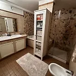 The accommodation includes a dressing area featuring a stone fireplace, and modern facilities like a television. The apartment is also furnished with a sofa and a work desk. A bathroom has a bidet, a bath, and a shower, as well as a hair dryer and bath sheets.